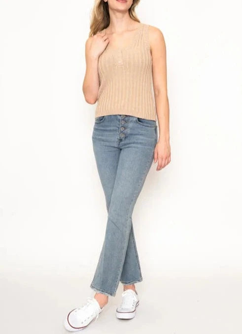 A sweater tank top blends the cozy comfort of a sweater with the relaxed style of a tank top, creating a versatile piece that's perfect for layering or wearing on its own.