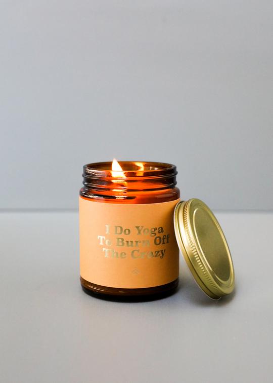 I Do Yoga To Burn Off The Crazy features fragrant notes of sweet peppermint, fresh eucalyptus, and a touch of cedarwood.