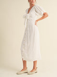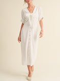 Adriana Button Down V-Neck Dress with Bow detail in White