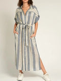 This neutral tone, striped button down dress is a year round must have. A classic staple that has a sophisticated and chic feel.