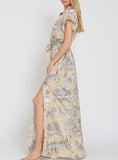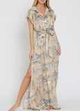 Mademoiselle Button Down Belted Maxi Abstract Dress in Begie/White