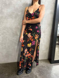 This dress features a flirty high slit and a stunning moonlit petal print. Perfect for a night out or a bohemian-inspired event, this dress will have you feeling effortlessly chic and playful. (Only 43 words, no quotes)