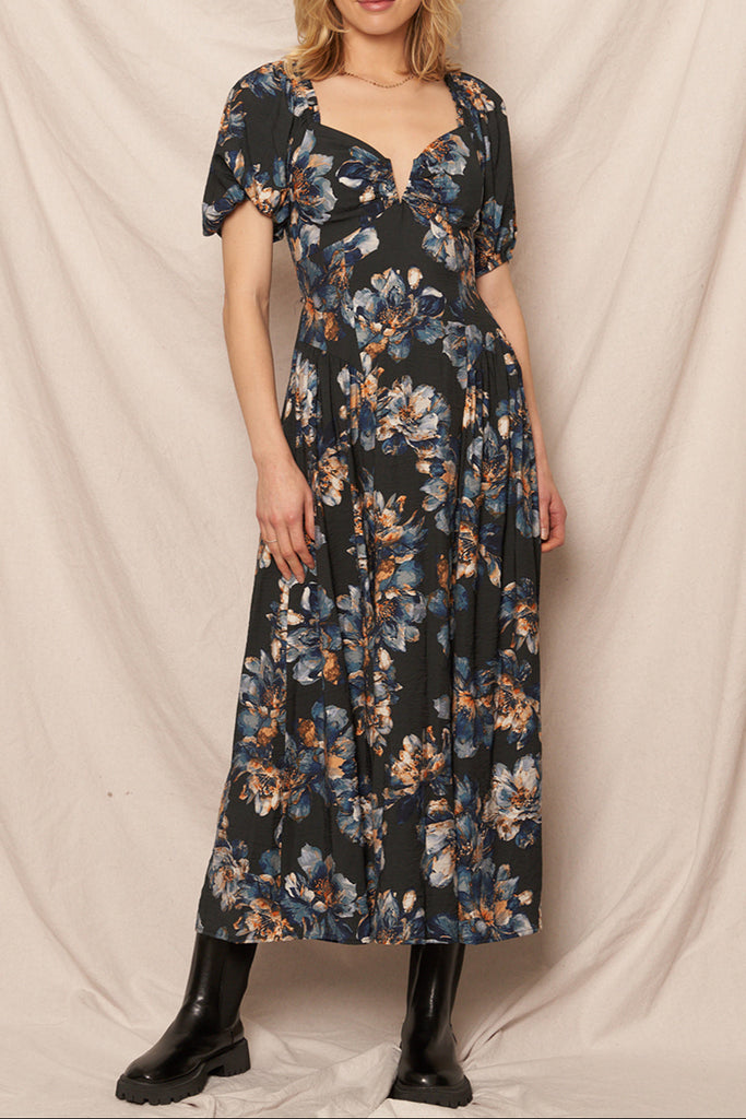 Step into the spotlight with the Nocturne Flora Maxi Dress. This dark blue and black floral maxi features charming puff sleeves and a flirty neckline that adds a touch of whimsy. The open back design brings a hint of daring elegance, perfect for turning heads at any event. Flowing and feminine, this dress combines playful details with graceful movement for a look that’s both bold and beautiful.