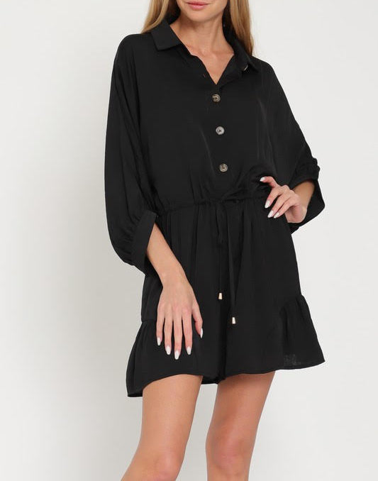 On the Town Satin Button Up Romper in Black