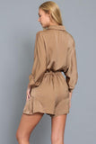 Chic button front satin romper with balloon sleeves and tie waist detailing.