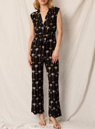 On Vacation Sleeveless Romper with Belt in Black/Multi