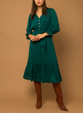 A jewel green midi dress with abalone buttons is a striking and elegant garment that combines a vibrant color with unique button detailing.This shade of green is deep and rich, resembling the color of precious gemstones. It adds a touch of opulence and sophistication to the overall look.