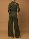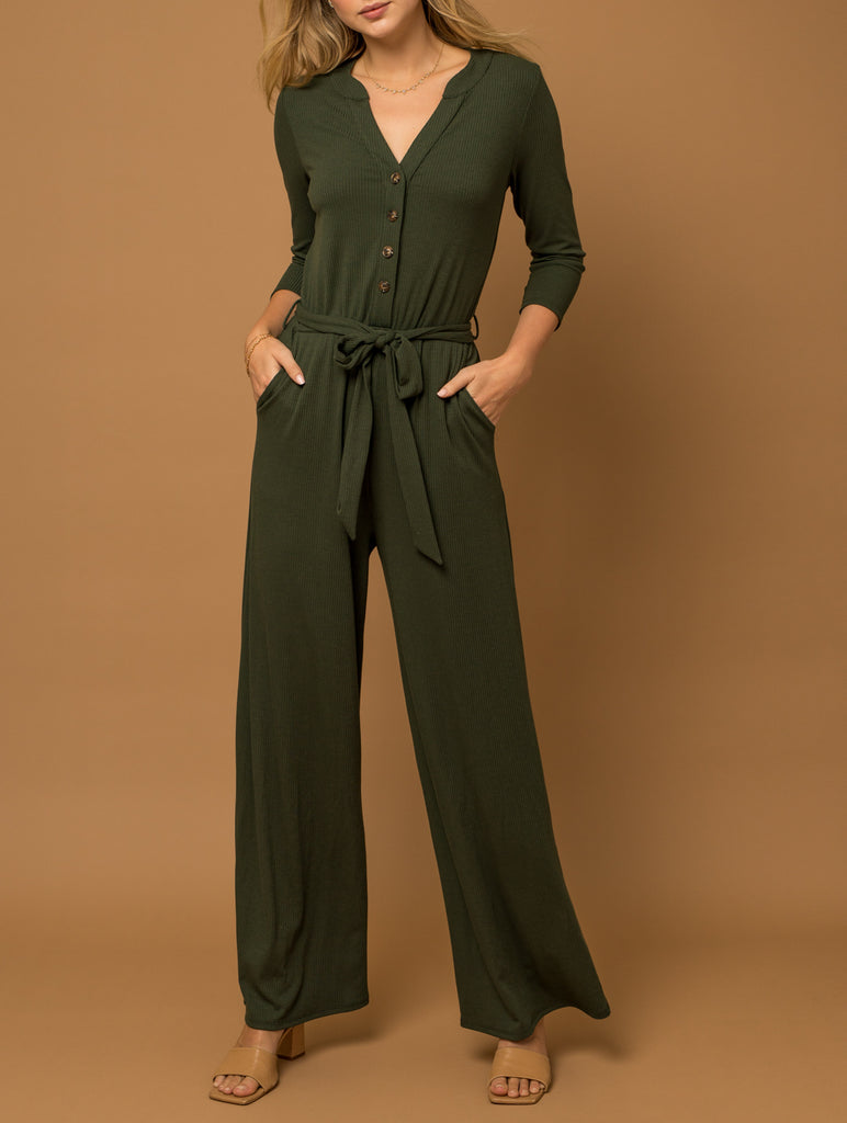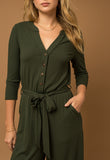 Roxanne 3/4 Sleeve Button Down Ribbed Jumpsuit with Wrap in Olive