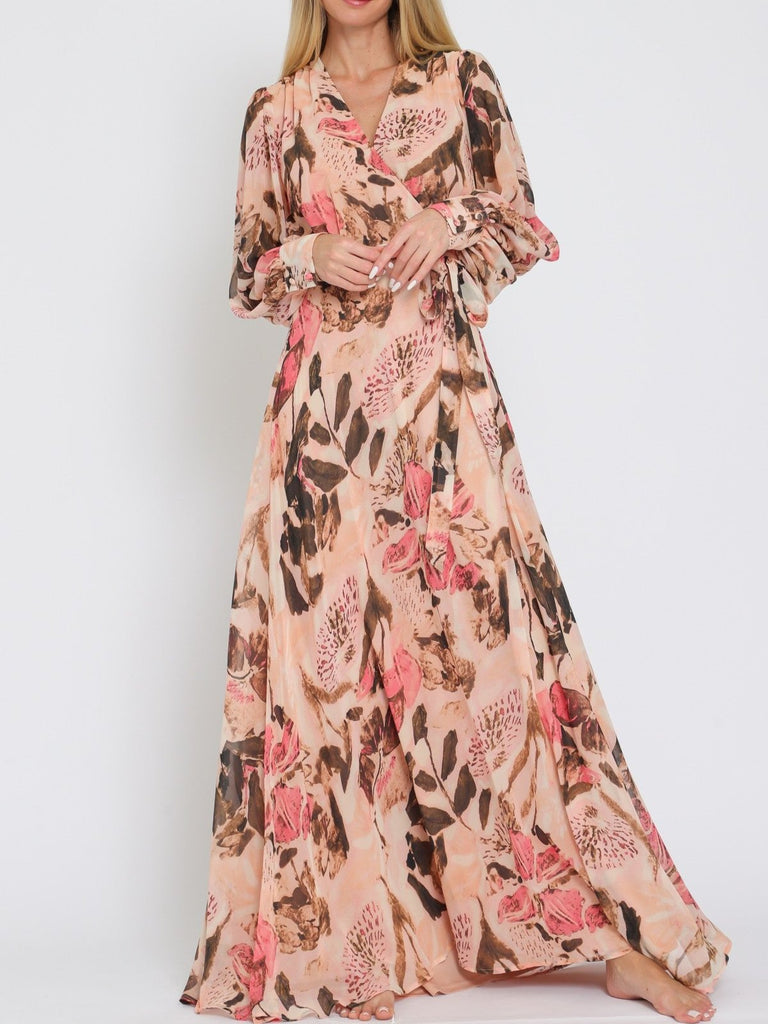 Sunset Bloom Sheer Long Sleeve Wrap Maxi Dress