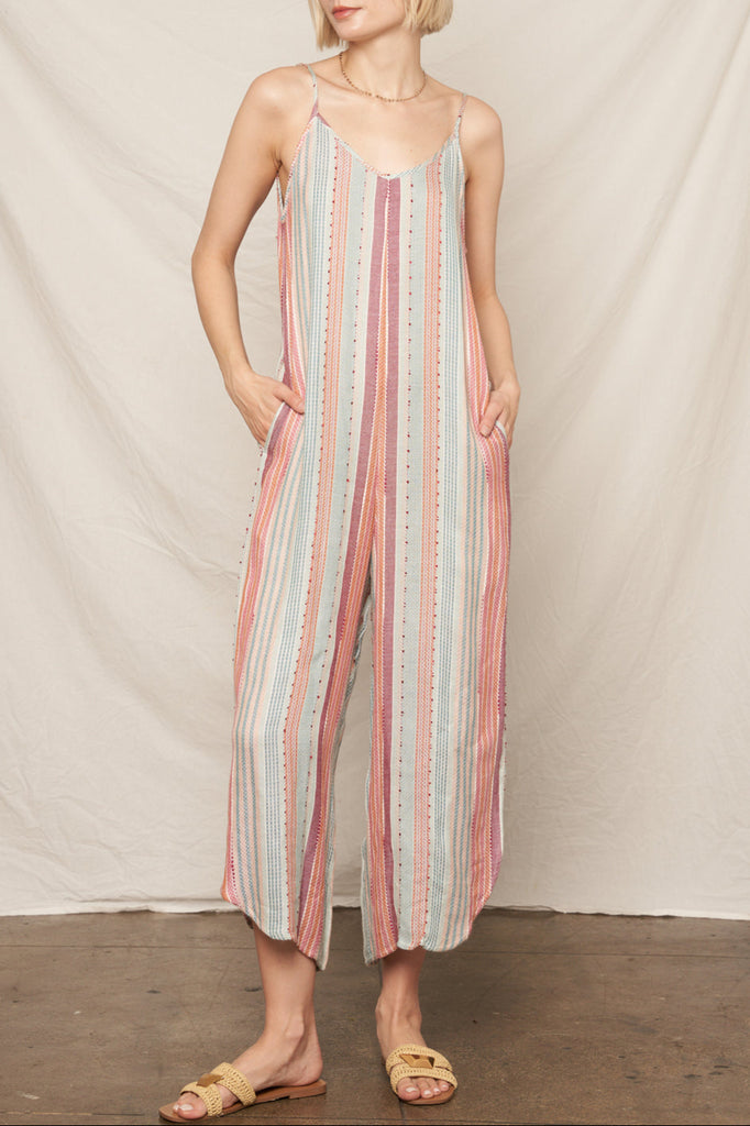 Brighten your day with the Sunset Stripes Jumpsuit! Featuring vibrant, colorful stripes and a breezy sleeveless design, this jumpsuit is perfect for playful summer adventures or casual outings. Its comfortable fit lets you move freely while turning heads wherever you go. Add a splash of fun to your wardrobe with this lively and easy-to-wear piece!