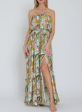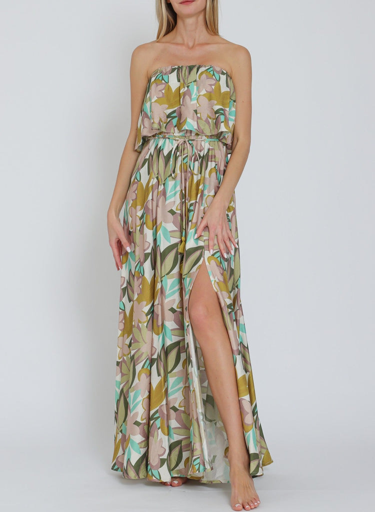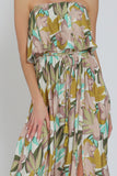 Watercolor Bloom Strapless Tassel Belted Maxi Dress