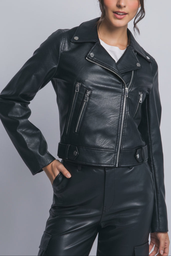 This classic faux leather moto jacket is the ultimate statement layer. Designed with an asymmetrical zip-front, sleek hardware details, and a structured yet flattering fit, it instantly elevates any outfit. Smooth and polished with just the right amount of edge, this jacket pairs perfectly with denim, dresses, or all-black looks for an effortlessly chic vibe.