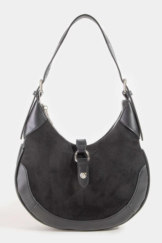Carry your essentials in style with this charming hobo bag that blends the best of both worlds. Crafted from a mix of faux soft suede and supple leather, it features a curved silhouette that's both modern and timeless. The mid-size design fits perfectly under your arm, making it ideal for everyday adventures, weekend getaways, or casual outings. With its relaxed vibe and sophisticated texture combo, this bag is your new go-to for effortless elegance.