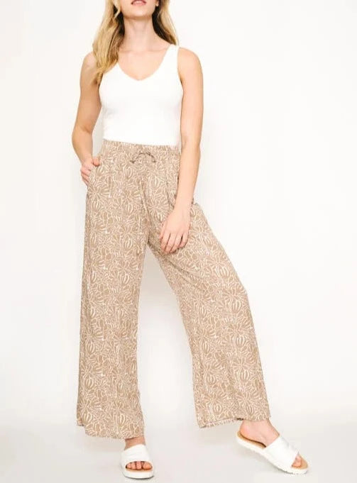 Amarillis Floral Print Wide Leg Drawstring Pants in Taupe