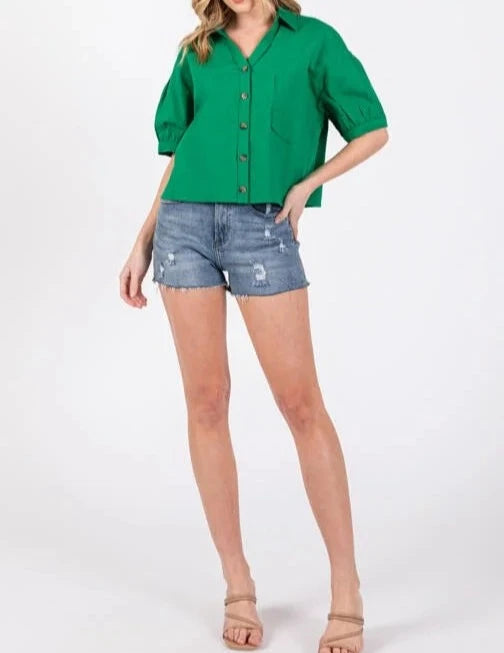 Dorthy Puff Sleeve V-Neck Button Up Cropped Top in Kelly Green