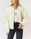 This jacket features a luxurious quilted gauze fabric that adds texture and warmth while maintaining a lightweight feel. The timeless cream hue with blue flower stitching on the sleeves effortlessly complements any ensemble, making it a versatile and stylish wardrobe essential.