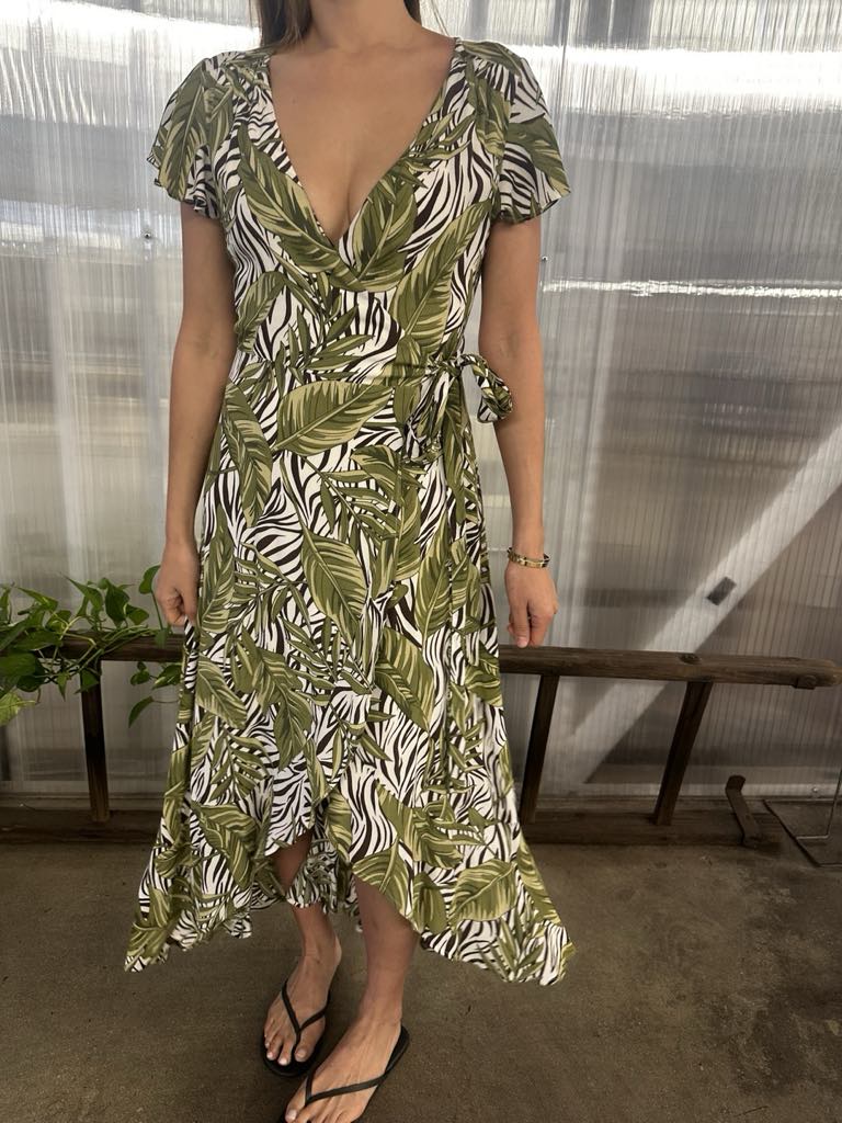 Get ready to hula in style with this playful and chic dress. Perfect for any tropical getaway, this dress features a stunning Hawaiian print and a flattering wrap design. Bring some Hawaiian vibes to your wardrobe and let your inner hula girl shine!