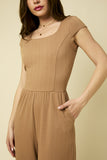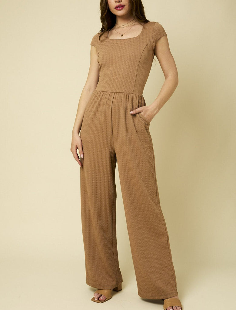 Step into effortless elegance with the Samantha Textured Short Sleeve Elastic Waist Jumpsuit in warm tan. This adorable piece combines comfort and style, making it a perfect go-to for any occasion!