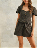 Shadow Puff Button Front Puffy Short Sleeve Top in Charcoal (set)