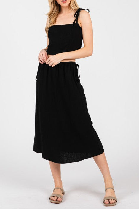 Embrace sunny vibes with the Soleil Noir Set, featuring a breezy linen cropped tank with charming shoulder ties and a flirty side-tie midi skirt. Perfect for playful days out or casual evenings, this duo combines comfort and style effortlessly. Light, breathable, and easy to mix and match, it’s your new go-to for warm-weather fun.