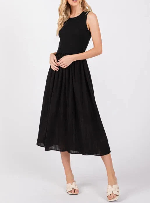 Spenser Ribbed Contrast Sleeveless Midi Dress in Black