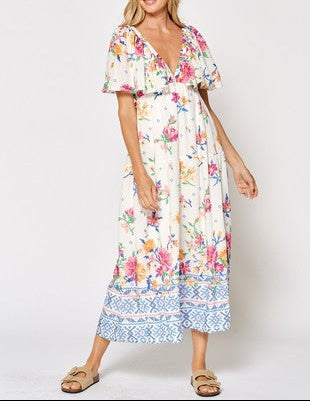 Spring Stitch Floral Print V-Neck Maxi Dress