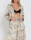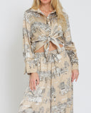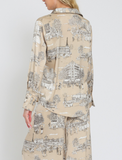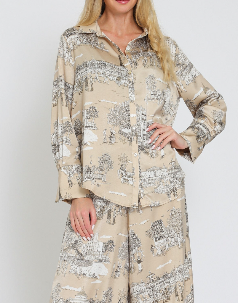 Summer in Paris Button Up Silk Long Sleeve Blouse in Beige/Multi