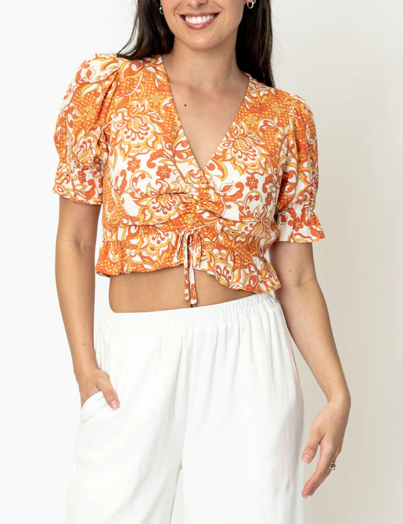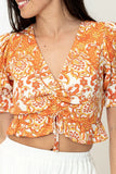 Tali V Neck Front Cinch Printed Top In Orange