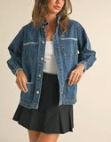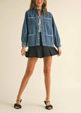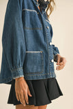 Discover effortless style with our Denim Jacket. Featuring a playful ruffled collar and delicate white whip stitching, this jacket adds a touch of elegance to any outfit. Perfect for any occasion, it's the perfect addition to your wardrobe. Elevate your look with this timeless piece.