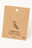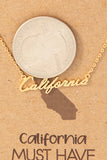 | Classic nameplate necklaces are such a cute, delicate way to show your love for the Golden State! Cursive calligraphy "California" nameplate necklace in gold-tone alloy (lead-and-nickel free). Lobster clasp on 16" delicate self-tone chain. |