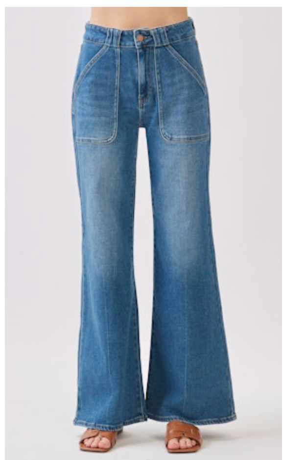 Rise and shine in these Classic Blues! Our high-rise denim features twin front pockets for all your essentials and a flattering flare cut that channels retro vibes with modern comfort. Perfect for dressing up or down, these jeans are your new go-to for effortless style that works from day to night.