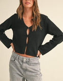 This cropped, long sleeve beauty brings a dash of sweet with its cream ribbed look. Included with the popular hook and eye front closure. Dress it up or down, and let the charm work its magic all day and night!