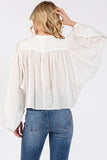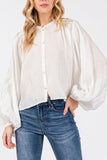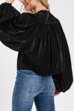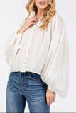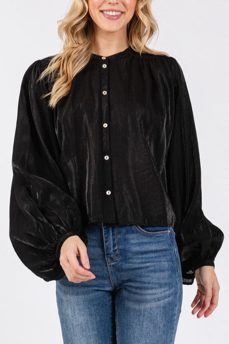 This blouse is made from a soft, shiny fabric that gives it a dressy look. It has a round neckline and buttons down the front. The sleeves are loose and puffy, gathered at the wrists for a stylish touch. The fit is relaxed and comfortable, making it easy to wear for both casual and dressy events.