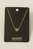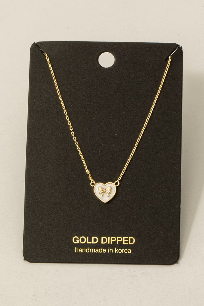 Dainty gold chain necklace with a small heart pendant detailed with a bow design.