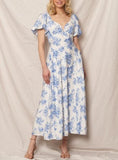 This dress exudes playful elegance, featuring a fitted top corset bodice that accentuates the waist and romantic puff sleeves for a touch of whimsy. With its flowing maxi style at the bottom adorned in a charming blue and white pattern, this dress effortlessly combines comfort and style, making it the perfect choice for any special occasion.