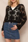 This black crochet button-up cardigan adds a charming, delicate layer to any outfit. Its intricate lace-like stitch work offers breathable comfort while the buttons let you style it open or closed. Perfect for adding a touch of whimsy and warmth, this cardigan pairs effortlessly with dresses or jeans for a look that’s both playful and cozy.