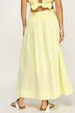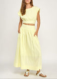 Brighten your wardrobe with our Lemon Grove Set! This playful ensemble features a sunny yellow crop top with a flirty bow tie back and elegant boat neckline. The matching midi skirt showcases a delicate eyelet pattern that adds texture and charm. Perfect for summer outings, brunches, or whenever you want to add a splash of sunshine to your day!