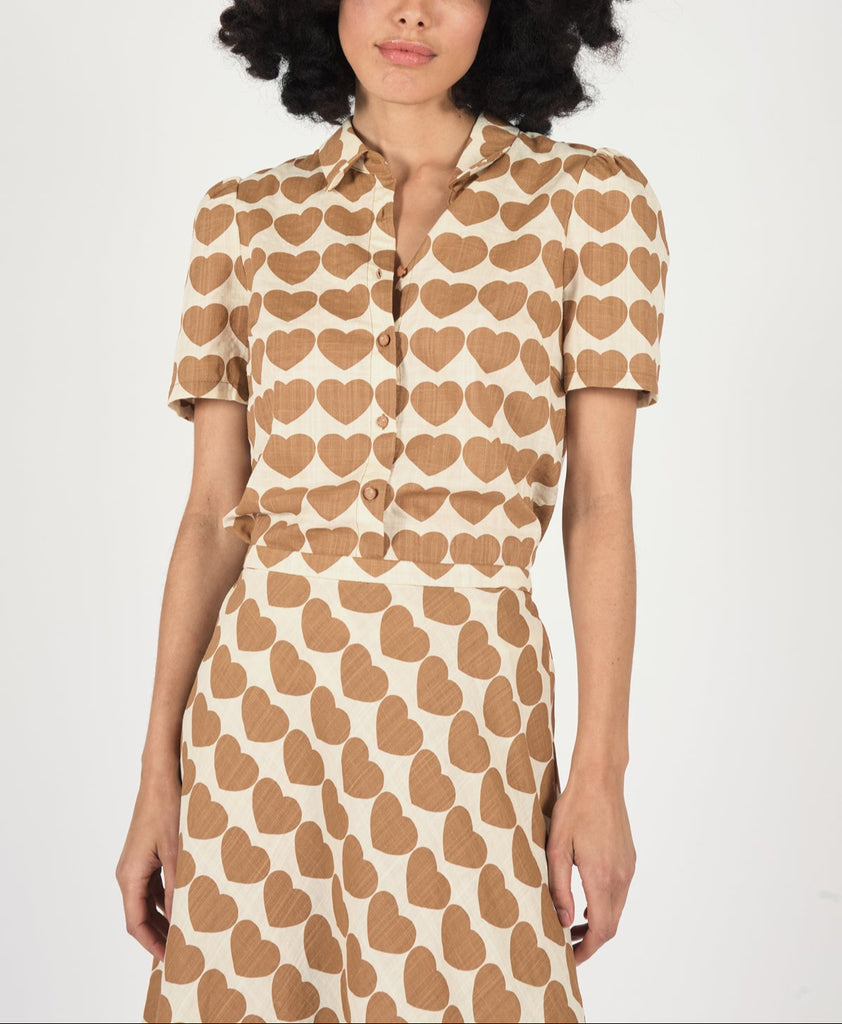 This quirky top features a heart print and button-up design, perfect for adding a playful touch to any outfit. Embrace your fun-loving side with this must-have piece.