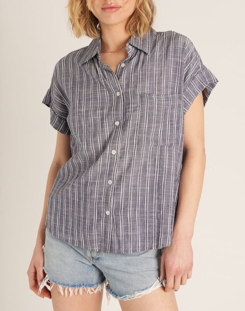 Featuring timeless navy stripes and a comfortable button-up design, this shirt is perfect for any casual occasion. Whether you're out for a day of fun or just relaxing with loved ones, this shirt will keep you looking sharp and feeling comfortable.