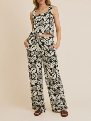 With its bold abstract pattern and wide leg pants, this set is sure to turn heads. The sleeveless top adds a touch of sophistication, while the comfortable fit ensures you'll be the life of the party!!