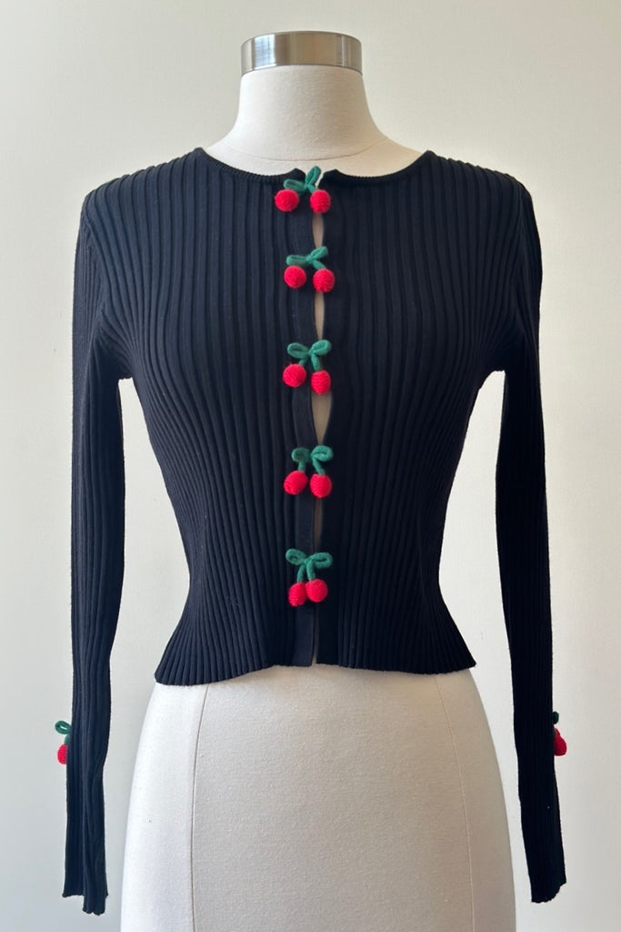 This cropped, long sleeve beauty brings a dash of sweet with its black ribbed looked and cherry embellishments Dress it up or down, and let the charm work its magic all day and night!