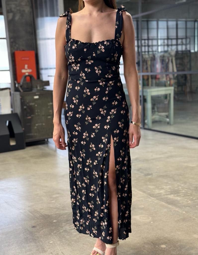 Embrace romantic vibes with this floral sweetheart midi dress! Featuring a delicate slit and charming milkmaid-inspired details, it’s perfect for garden parties or dreamy date nights. Feminine, flirty, and oh-so-pretty!
