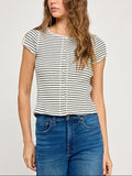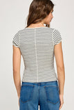 Elevate your casual wardrobe with our Nerina Top! This playful button-down T-shirt features eye-catching horizontal stripes and a comfortable ribbed texture. The delicate lace detail along the neckline adds just the right touch of feminine charm. Perfect for mixing and matching with your favorite bottoms for an effortlessly stylish look!