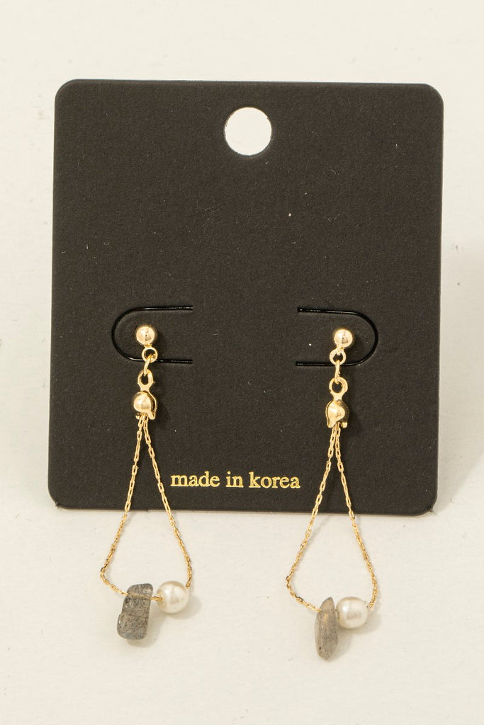 Add a touch of charm with these Pearl and Stone Drop Earrings. Their delicate gold chain design dances with subtle stones and a hint of pearl, perfect for brightening up any outfit. Light and lovely, these earrings bring a playful sparkle to your day.