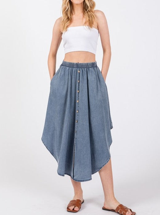 Sandy Feet Button Front Elastic Waist Denim Skirt