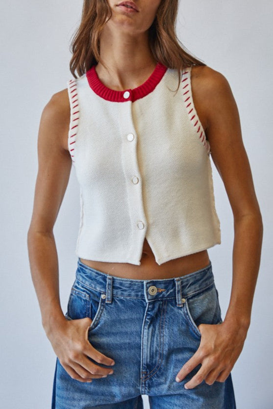Turn heads with the Scarlet Stitch Sweater Vest Top, where cozy ivory knit meets bold red stitch details. This playful button-down vest adds charm and warmth to your outfit, perfect for layering or wearing solo on cool days. Embrace a fun twist on classic style with this eye-catching, comfy piece.