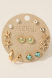 This fun earring set includes gold huggie hoops, starfish, seashells, pearl studs, turquoise studs and diamond studs.