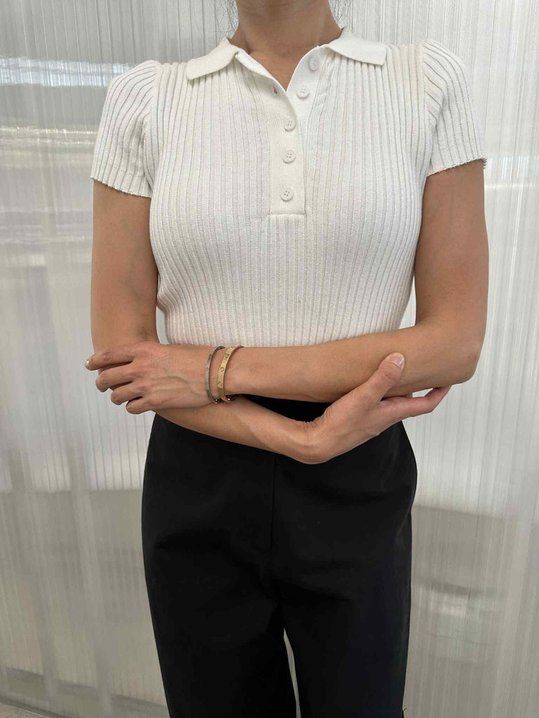 Show off your sporty side with the Varsity Charm Tee. This white ribbed polo-style cropped tee combines classic charm with a fresh, flirty twist. Perfect for sunny days or layering, its fitted ribbed texture offers a flattering shape while keeping things cool and casual. Add a dash of playful attitude to any outfit with this versatile wardrobe staple.