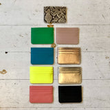 Keep your cards and cash close with this convenient and cool card holder featuring bold colors, cool metallic's, beautiful naturals, and fun snake skin!