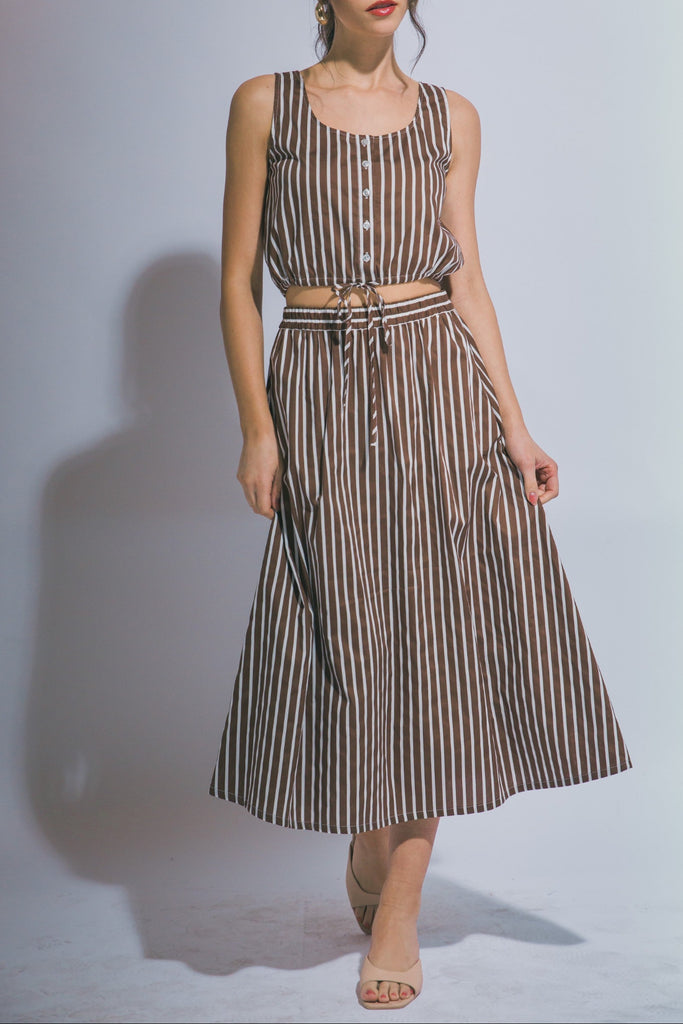 Effortless and easy to wear, the Café Stripe Set brings a relaxed, polished feel to everyday dressing. Designed with a sleeveless button-front top and a flowing midi skirt, the soft vertical stripe elongates while keeping the look light and comfortable.